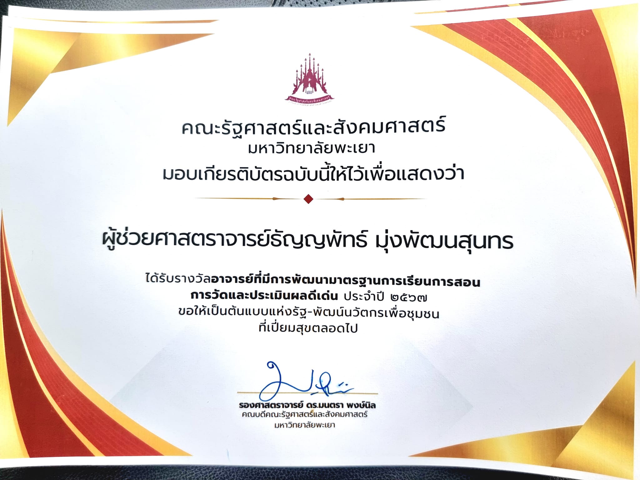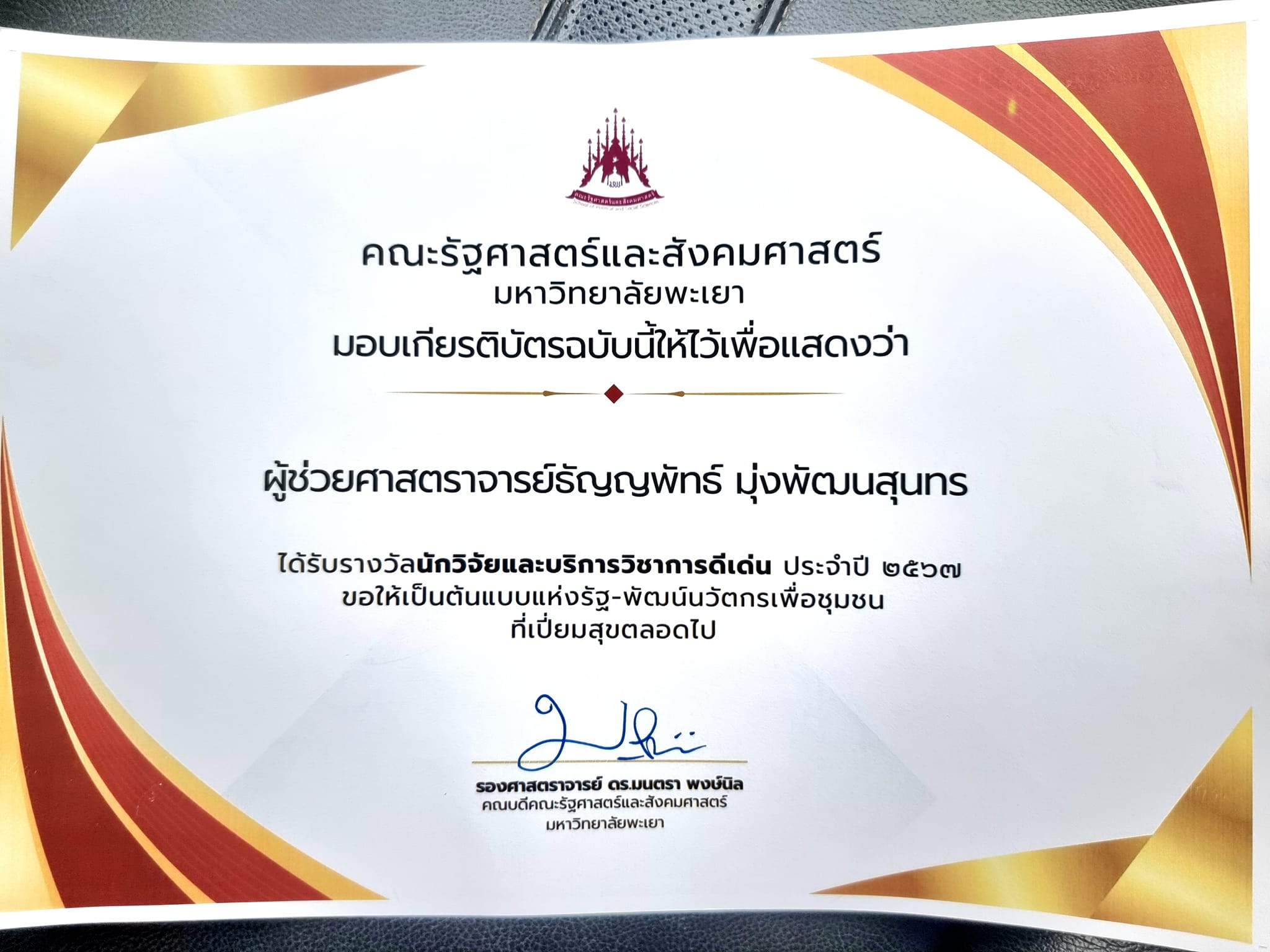 | 2 | 4 ก.ค. 2568 | รางวัลที่ได้รับ คณะ | รางวัลนักวิจัยและบริหารวิชาการดีเด่น ประจำปี 2567 คณะรัฐศาสตร์และสังคมศาสตร์ |