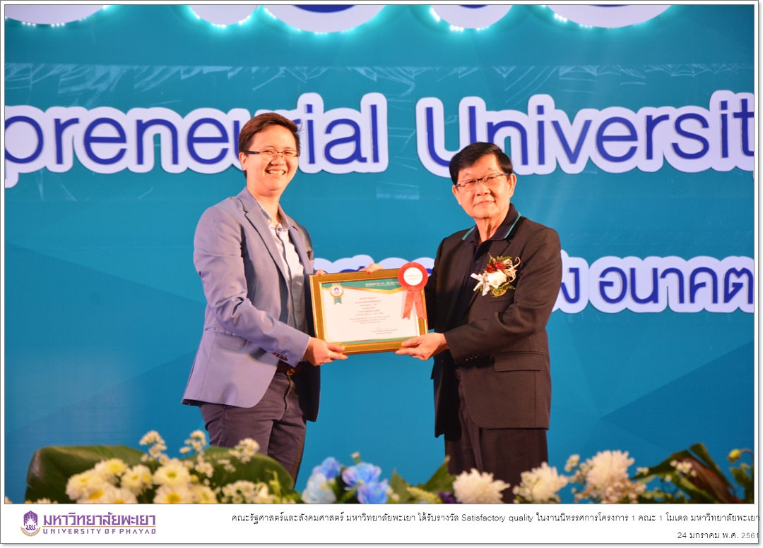 คณะรัฐศาสตร์และสังคมศาสตร์ มหาวิทยาลัยพะเยา ได้รับรางวัล Satisfactory quality ในการนำเสนอผลงานโครงการวิจัย (โครงการ Maeka’s Green Power) ในงานนิทรรศการโครงการ 1 คณะ 1 โมเดล มหาวิทยาลัยพะเยา